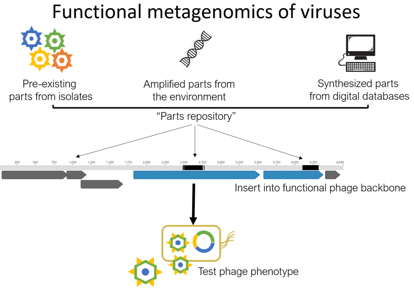 What makes this system so unique is that it is amendable to genetic manipulation using simple molecular biological techniques – genes or entire genomes can be synthesized in-vitro and functional viruses can be produced essentially from scratch. Hybrid phages can be built with parts sourced from isolates, from environmental PCR or de-novo synthesis from digital templates. Therefore, the function of individual genomic parts can be studied in great detail.